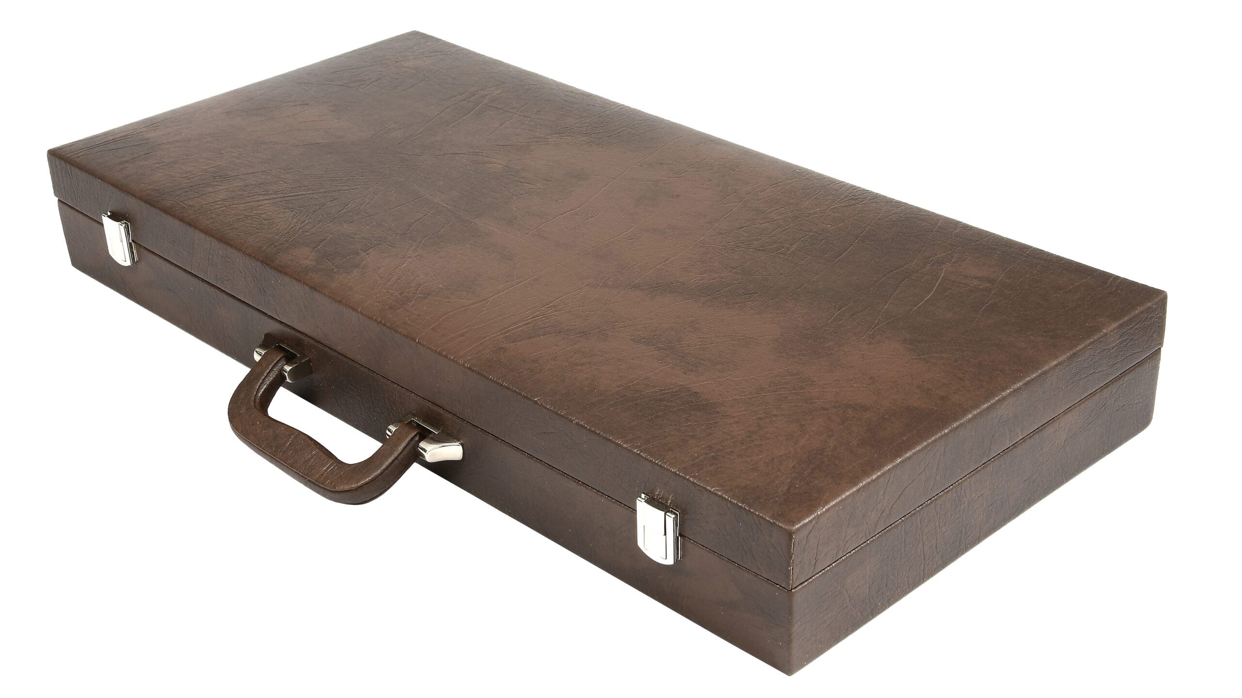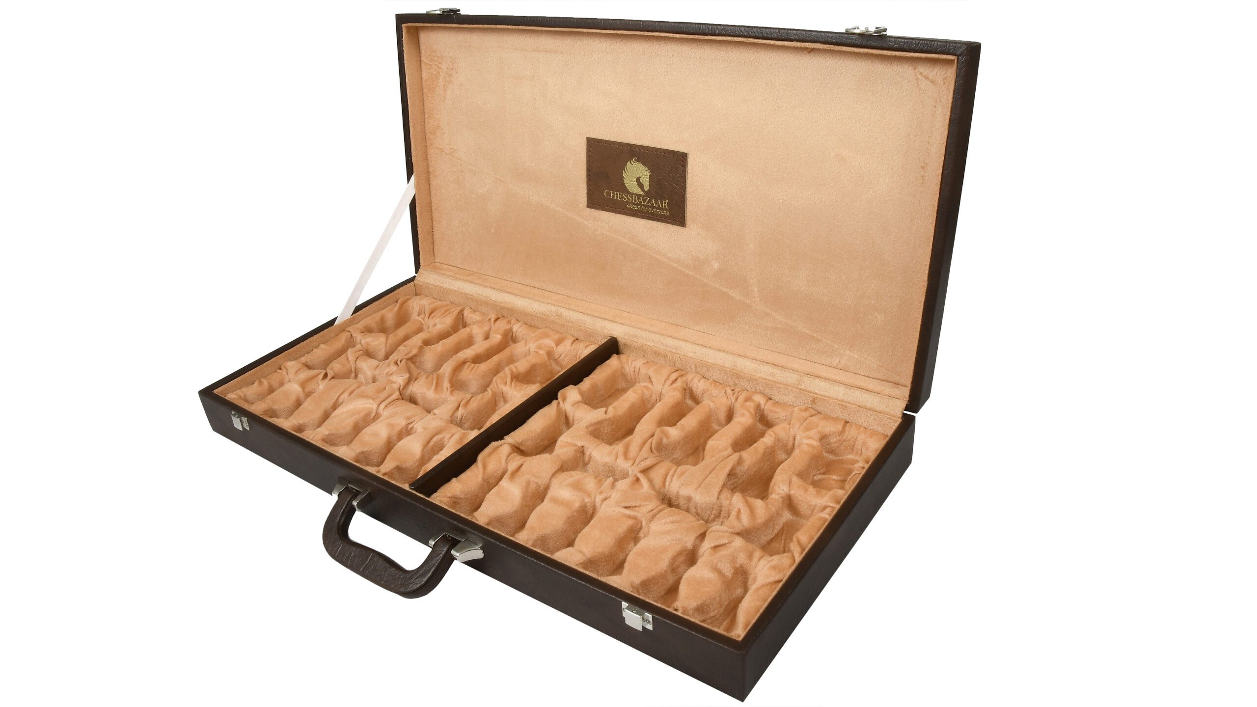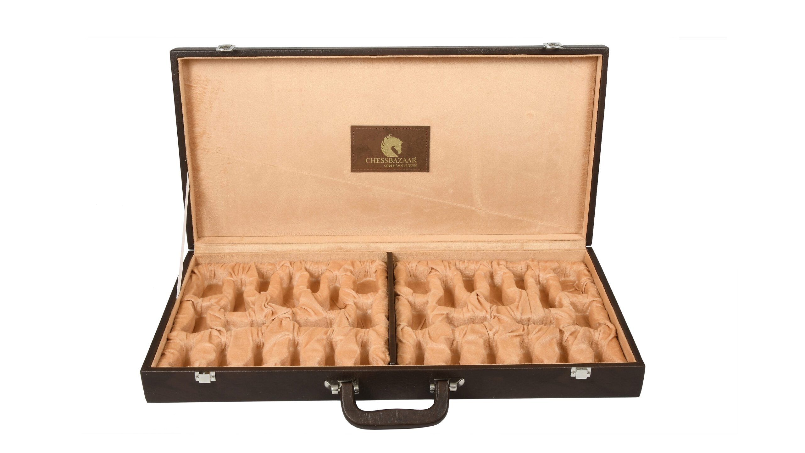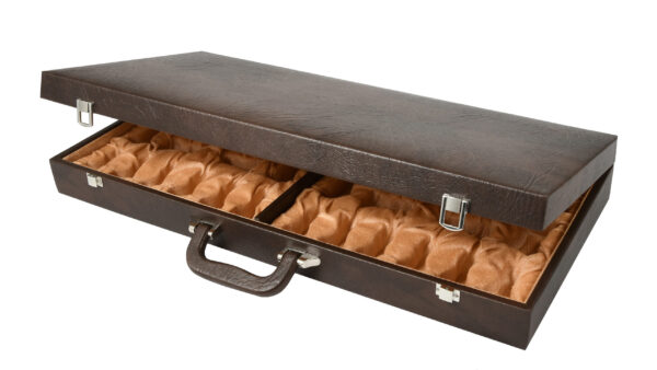 3.75″ – 4.1″ PIECES: BROWN LEATHERETTE CHESS SET STORAGE BOX COFFER WITH DOUBLE TRAY FIXED SLOTS CI-1172