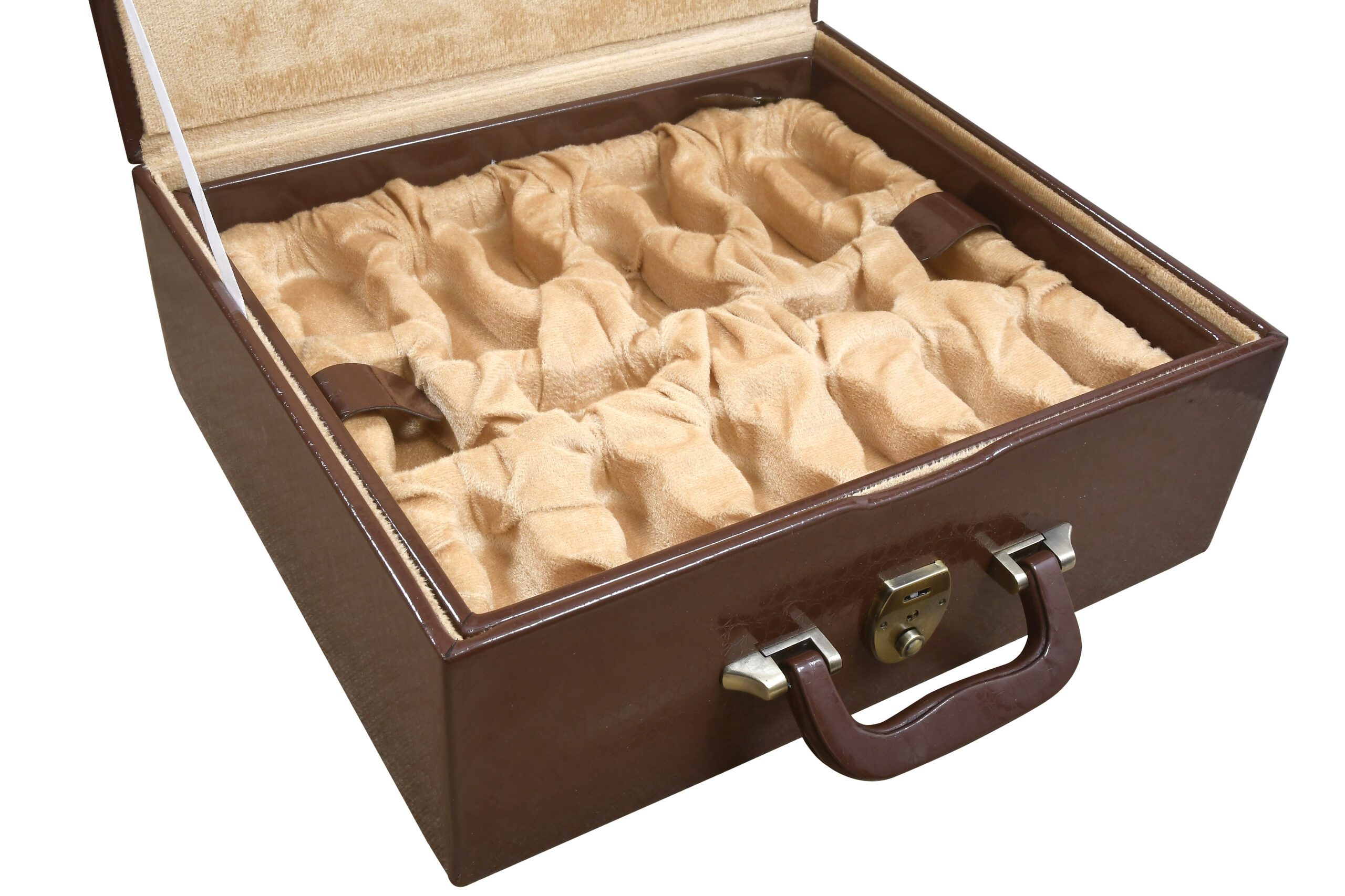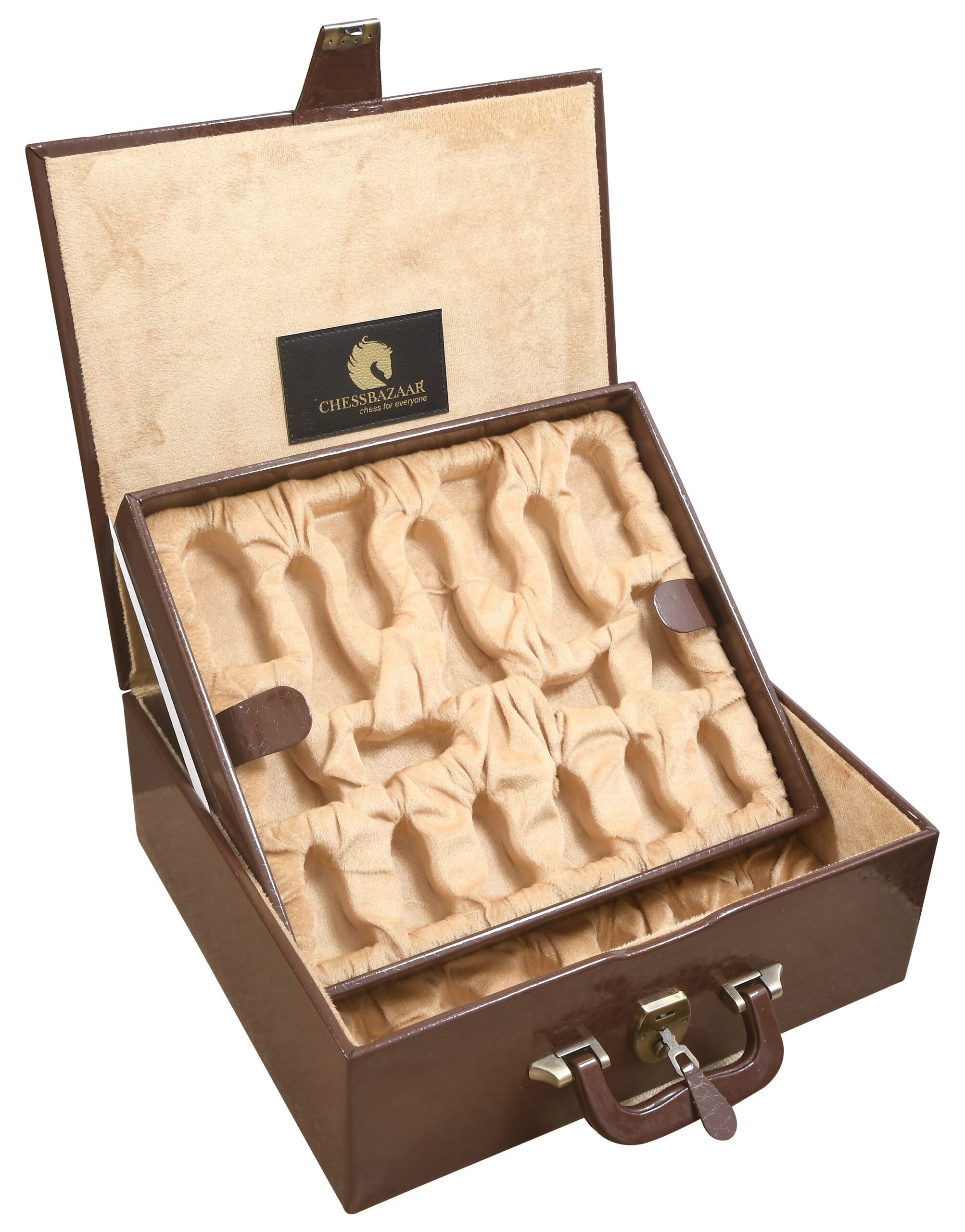 3.75″ – 4.1″ PIECES: BROWN LEATHERETTE CHESS SET STORAGE BOX COFFER WITH DOUBLE TRAY FIXED SLOTS CI-1172